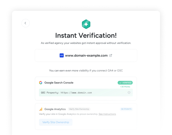 Publishers earn points for each verification method (GA4, GSC, DNS, Meta Tag). 60+ points = highly verified.